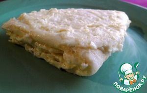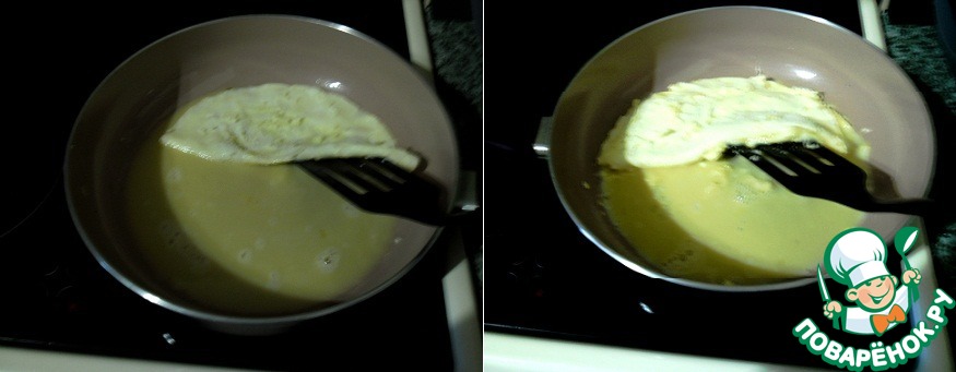 предыдущую часть слегка приподнять лопаткой, а сковороду нагнуть так, чтобы под первый слой немного пролилось жидкого омлета. Слегка припёкшийся омлет переворачиваем - первую часть на вновь налитый. Вновь вливаем порцию омлетной массы и т. д -