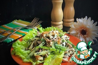 Вкусный, куриный салат с не хитрым набором продуктов. Сочный, свежий, интересный. Угощайтесь!