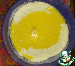 В тёплое молоко добавить яйцо, растопленное сливочное масло, растительное масло, соль и сахар, перемешать. Вылить жидкость к муке.