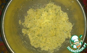 Приготовим начинку. В миске соединить творог, яйцо, соль, мелко нарезанный укроп, измельчённый чеснок и натертый сыр. Хорошо перемешать.