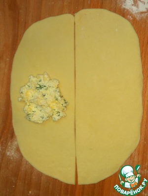Каждый кусочек теста раскатать в овал, разрезать пополам, в середину одной половины овала положить немного начинки.