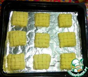 Накрыть начинку краем теста. Оставшиеся два свободных края теста разрезать на полоски.
