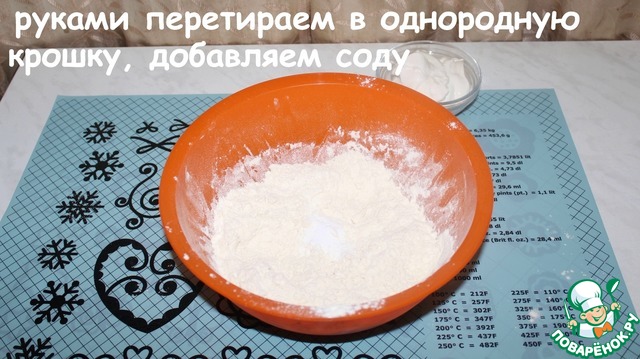 Руками перетираем в однородную крошку. Добавляем соду и перемешиваем.