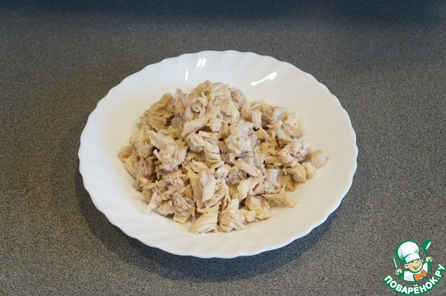 Курицу и морковь сварить по отдельности в подсоленной воде до готовности, остудить. Освободить куриное мясо от шкурки и косточек. Нарезать небольшими кусочками.