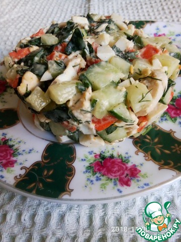 Выложить салат на тарелку (я использовала кольцо), сверху заправку.