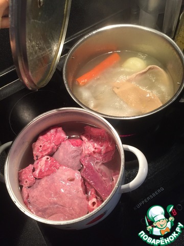 Рубец я положила варить отдельно и заранее. Он должен вариться 4-5 часов. В одном рецепте тут прочитала что можно положить в воду лук и морковку, что я и сделала. Немного подсолила воду.