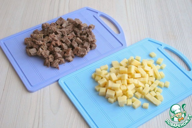 Говядину отварить заранее. Нарезать говядину кубиками. Голландский сыр нарезать кубиками.