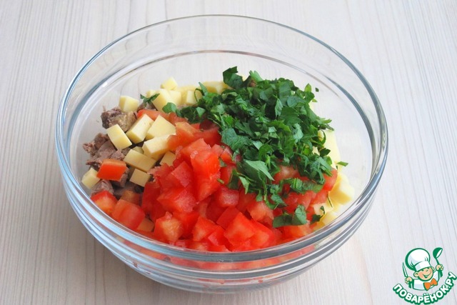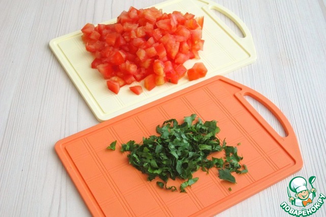 Крупный помидор разрезать на две части, удалить лишнюю влагу и семена. Нарезать помидорные чашечки кубиками. Петрушку мелко нашинковать.