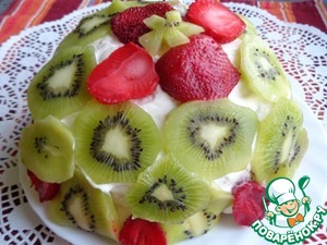 Коржи соединить. Промазать со всех сторон кремом. Оформить, на Ваше усмотрение, клубникой и киви.