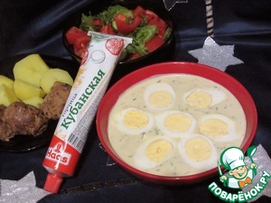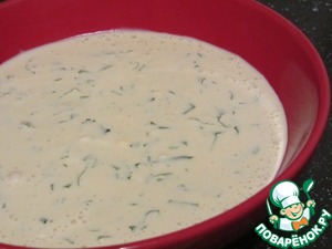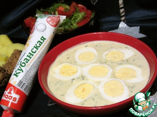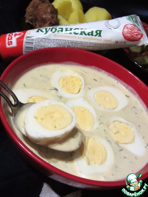 Добавить в соус зелень и нарезанное кубиками яйцо, хорошо перемешать. По вкусу добавить соль, перец и сахар, хорошо перемешать.