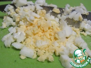 Яйца очистить, одно яйцо нарезать мелкими кубиками. -