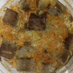 Остывшую печень порезать большими кубиками и выложить в жаропрочную посуду переслаивая жареными луком с морковью.