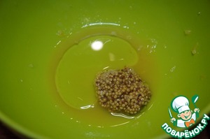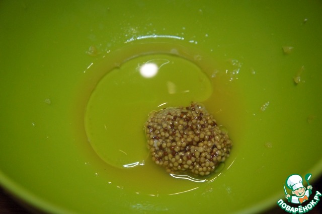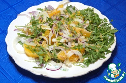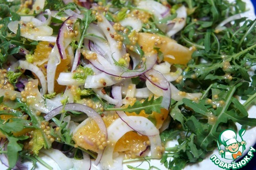 Смешать венчиком сок из апельсинов с маслом и горчицей до состояния суспензии. Полить салат и очень легко, лучше руками, перемешать его.