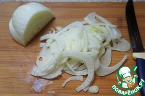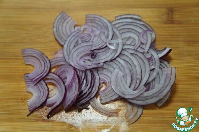 Также, очень тонко нарезать красную луковицу, полуколечками.