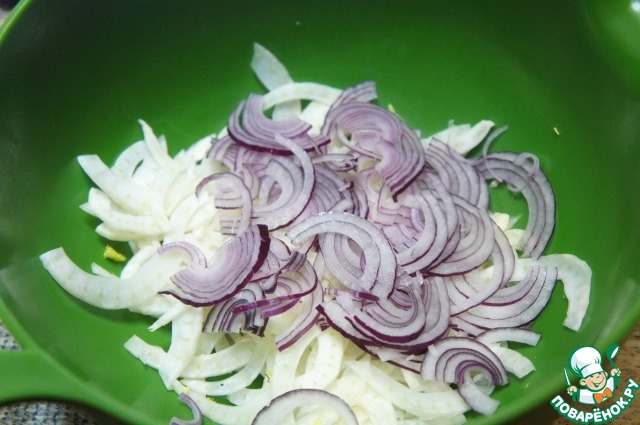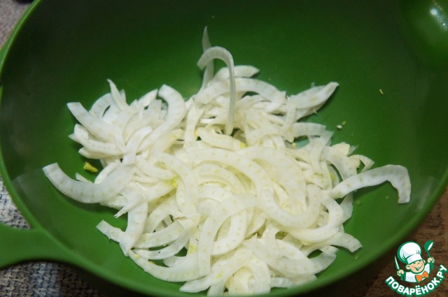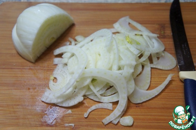 У фенхеля отрезать жесткие стебли, саму луковицу нарезать очень тонкими ломтиками. -
