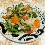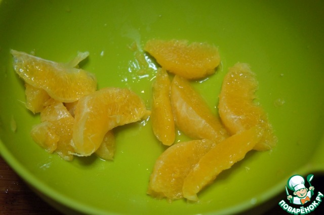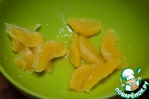 Апельсин тщательно очистить от кожуры и затем над миской вырезать филе, собирая стекающий сок. Из 2-3 долек выжать сок. Добавить филе к салату. Туда же добавить рукколу.