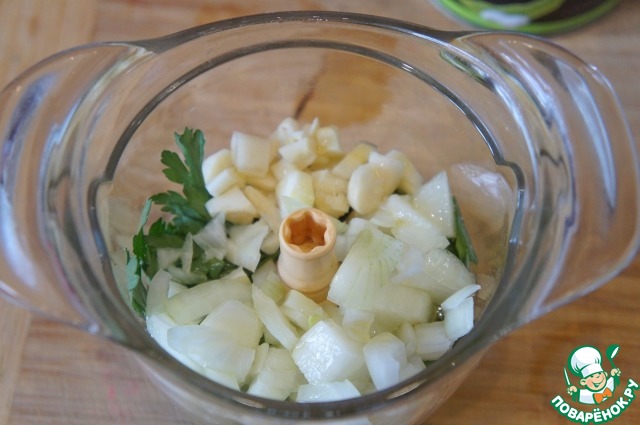 В измельчитель сложить чеснок, нарезанный лук, листья петрушки и половину листьев базилика, влить 2 ст. л. масла.