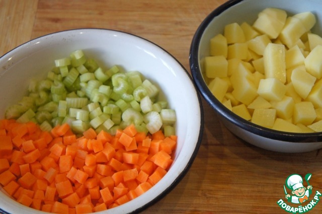 Морковь и сельдерей нарезать маленькими кубиками. Картофель кубиками покрупнее.