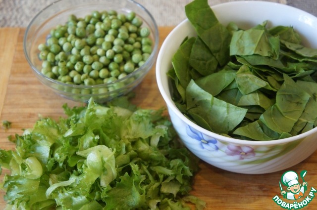 Шпинат грубо нарезать, удалив стебли, листья салата нарвать руками на кусочки.