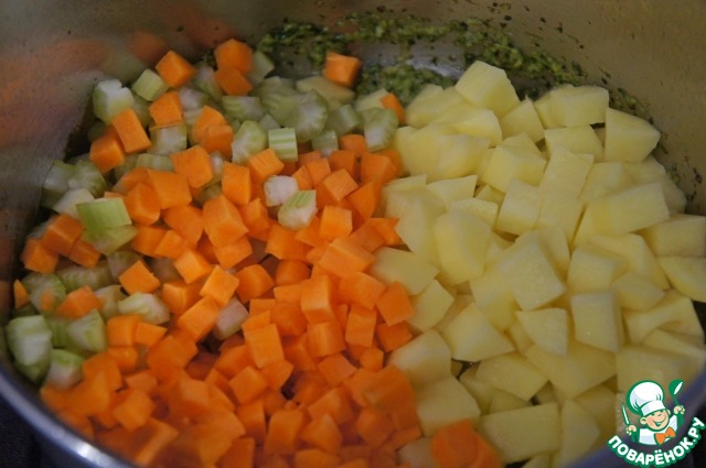 Добавить нарезанные картофель, сельдерей и морковь. Обжарить несколько минут.