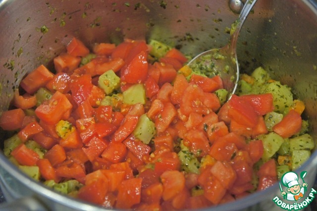 Затем всыпать помидоры и все вместе еще немного потушить.