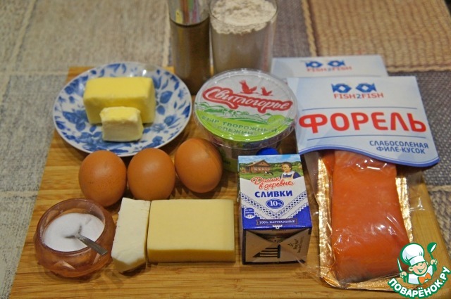 Творожный сыр, сливки, 2 яйца и белок, оставшийся от теста, взбейте. Добавте по вкусу соль-перец. Учитывайте, что рыбка солененькая.