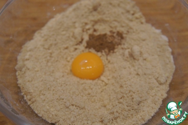 Вбейте желток. Я еще добавила немного мускатного ореха для аромата. Быстро замесите эластичное тесто. К рукам липнуть не должно, если липнет, добавьте муки. Если же наоборот не собирается в комок, влейте 1-2 ложки ледяной воды.