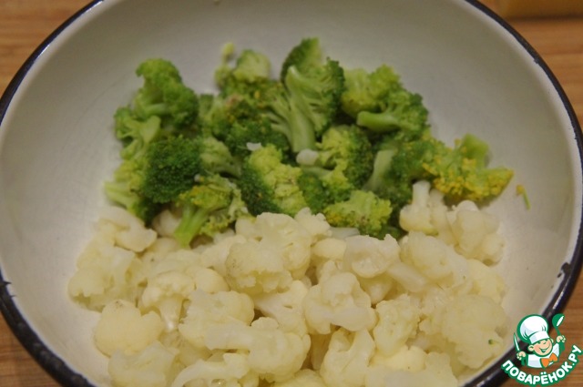 Тем временем капусту разберите на соцветия, по отдельности бланшируйте в кипящей, подсоленной воде 5-7 минут, стараясь не переварить. Откиньте на дуршлаг и остудите.