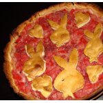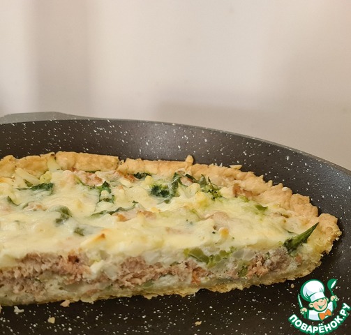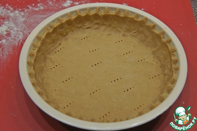 Тесто раскатайте толщиной примерно 5 мм и распределите по форме d 22 см. Многократно наколите вилкой. Разложите на тесто начинку.
