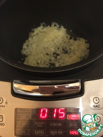 В мультиварке выставляем режим "Жарка". Добавляем масло, ждем минутку, выкладываем порезанный мелким кубиком лук. Чеснок давим через чеснокодавку или ржем меленько. Добавляем к лучку. Крышку не закрываем.