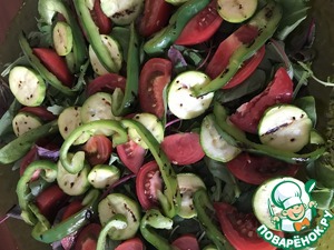 Помидоры порезать тонкими дольками. Выложить на салатные листья, присолить. Добавить кабачки и перец.