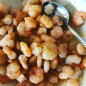 Креветки отварить пару минут, выложить в тарелку. Приготовить заправку: выдавить дольку чеснока, налить 2 ложки оливкового масла, добавить соль и перец. Перемешать и добавить к креветкам.
