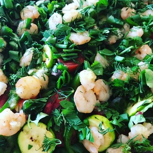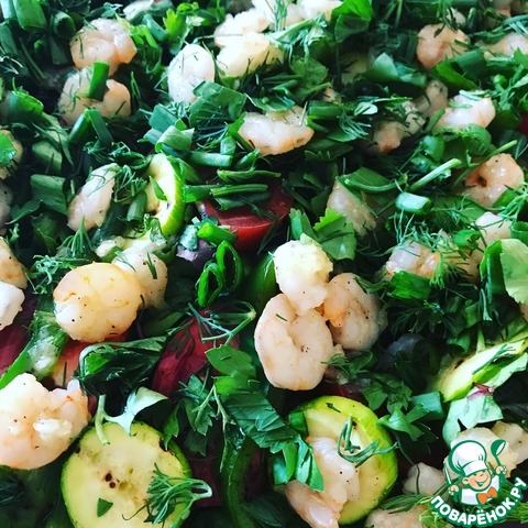 Креветки вместе с заправкой равномерно распределить по салату. Сверху посыпать нарезанной зеленью.