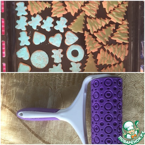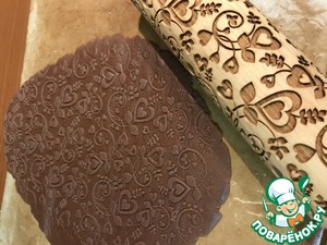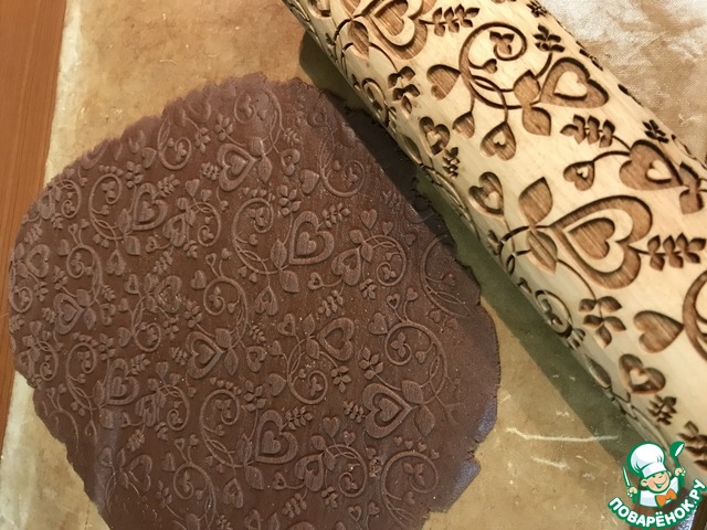 Тесто раскатать сначала обычной скалкой, потом пройтись скалочкой с рисунком чуть надавливая.