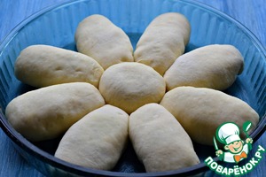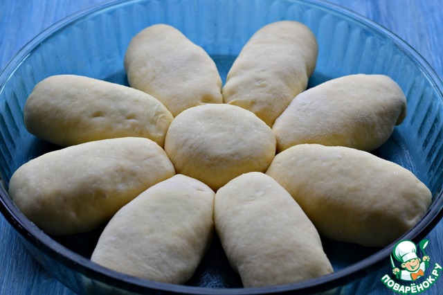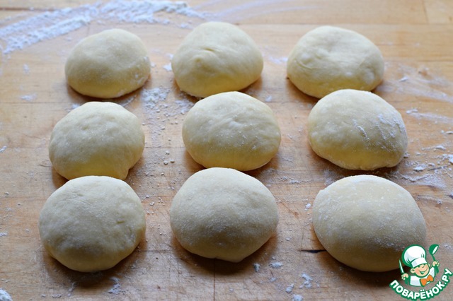Подошедшее тесто выложить на рабочую поверхность, присыпанную мукой, обмять, разделить на 9 равных частей (округлить заготовки)