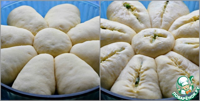 Выложить заготовки в форму для выпечки (d 24 см) в виде цветка (рулеты - лепестки, круглая булочка - серединка)
