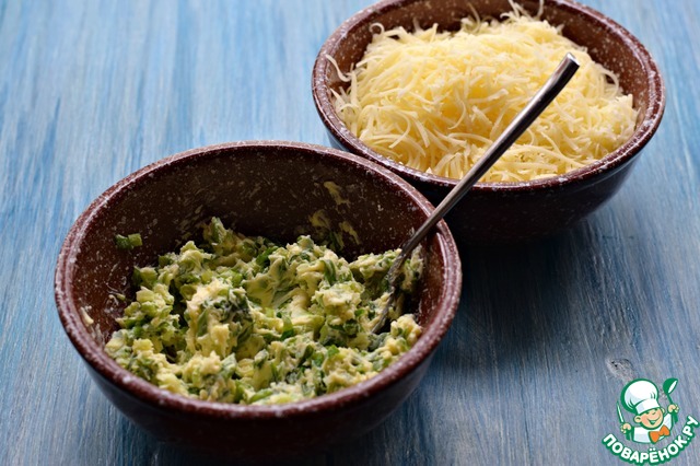 Оставшиеся 40 граммов сливочного масло смешать с чесночным порошком (можно использовать свежий измельченный чеснок) и мелко нарезанным зеленым луком. -