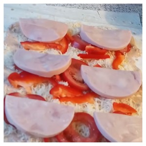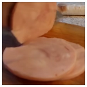 1) Ветчину нужно нарезать на полу-кружочки.