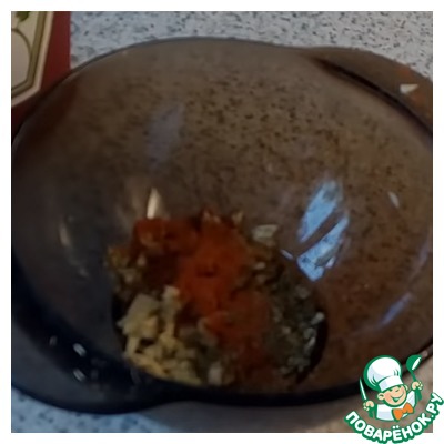 В миску перекладываем нарубленный чеснок, добавляем немного нарубленного укропа, нарубленную петрушки и паприку.