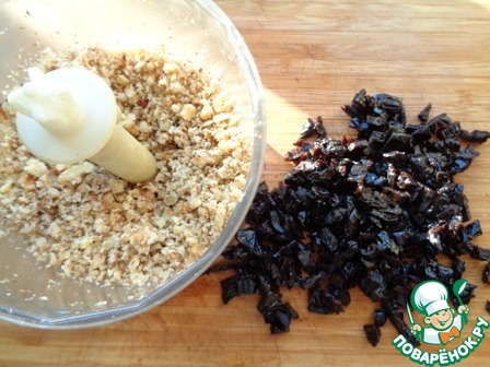 Чернослив порезать мелко (если сухой замочить в холодной воде на 20 минут), грецкий орех поджарить на сухой сковороде минут шесть и измельчить.