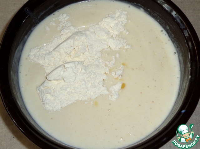 Через 5 минут добавляем растительное масло и соль. Насыпаем муку, замешиваем густое тесто.