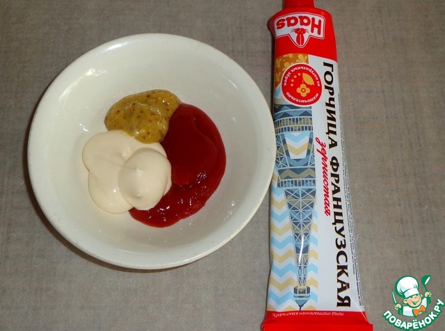 Смешиваем для соуса горчицу, кетчуп и майонез.