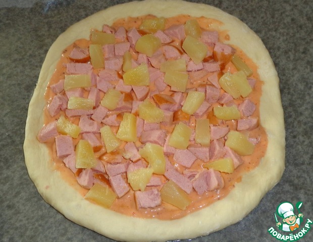 Тесто раскатываем в круглую лепешку. Кладем на противень с пергаментной бумагой. Смазываем соусом. Ананасы и сосиску режем кубиками. Рассыпаем начинку по соусу.