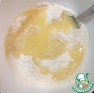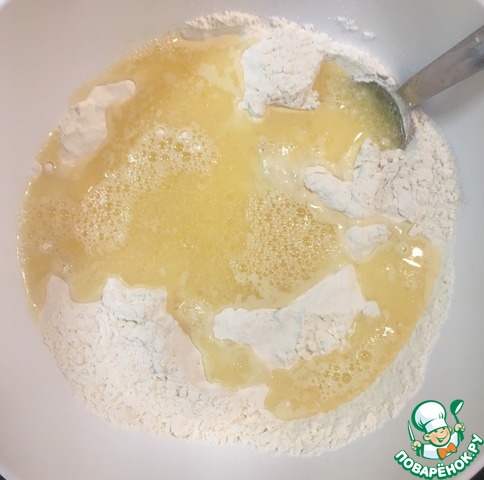 Вливаем яйцо с водой в мучную смесь, перемешиваем.