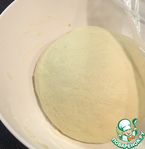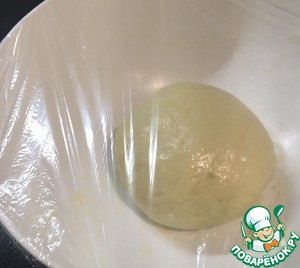 Убираем тесто в емкость, накрываем пищевой пленкой. Оставляем настаиваться 40 минут.