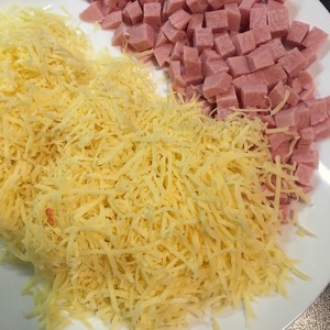 Пока тесто подходит мы подготавливаем начинку, сосиски режем мелким кубиком, сыр трем на мелкой терке.