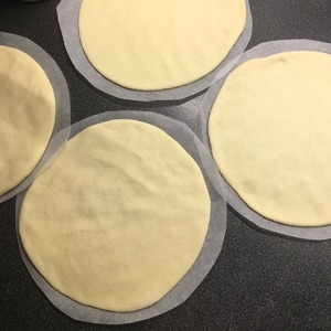 Каждый шарик теста при помощи скалки раскатываем в лепешку не очень тонко, толщина около 3-4 мм, диаметр 15-16 см. Перекладываем каждую заготовку на листик пергамента.