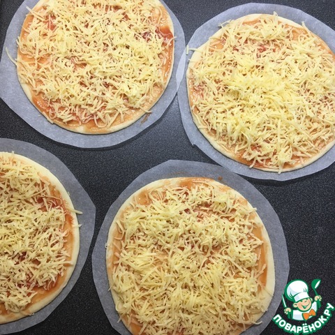 Выкладываем сосиски. Откладываем пару пицц, что бы приготовить сейчас, а остальные заготовки пиццы вместе с пергаментом в морозилку на 20-30 минут.