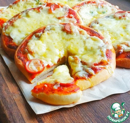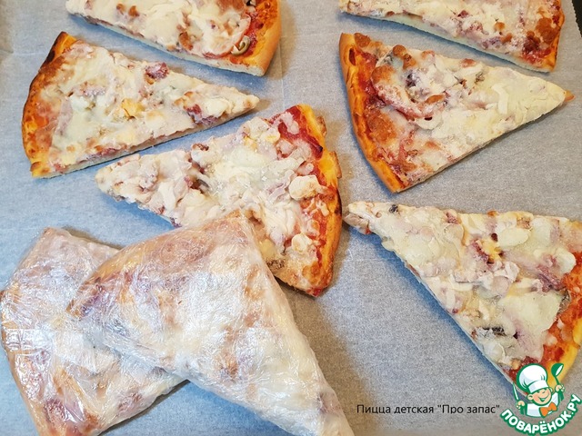 Мой ребенок обожает пиццу и готов ее есть на завтрак, обед и ужин. Но, бывает так лень, ради одной пиццы разводить грязь на кухне и тратить время. Предлагают Вам мой вариант Детской пиццы, которую я готовлю "про запас" и замораживаю, очень удобно, один раз стоит заморочиться и 10 порций пицц всегда ждут в морозилке своего часа. Пицца, приготовленная по этому рецепту, после размораживания остается такой же вкусной и мягкой, как только что приготовленная. Мой вариант детской пиццы содержит минимальную начинку, так как мой ребенок категорически не приемлет помидоры, перец, маслины и прочие компоненты, я готовлю пиццу, используя только кетчуп, сыр и сосиски, хотя порезанный на кубики маринованный огурчик был бы очень в тему)