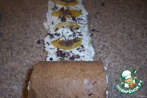 берем один кусочек тёмного рулета,размотать,пропитать,намазать кремом,выложить бананы,посыпать шоколадом,свернуть рулет, под него подкладываем белый кусок рулета, также смазываем кремом, кладём персики, посыпаем шоколадом, сворачиваем вместе с коричневым рулетом. -